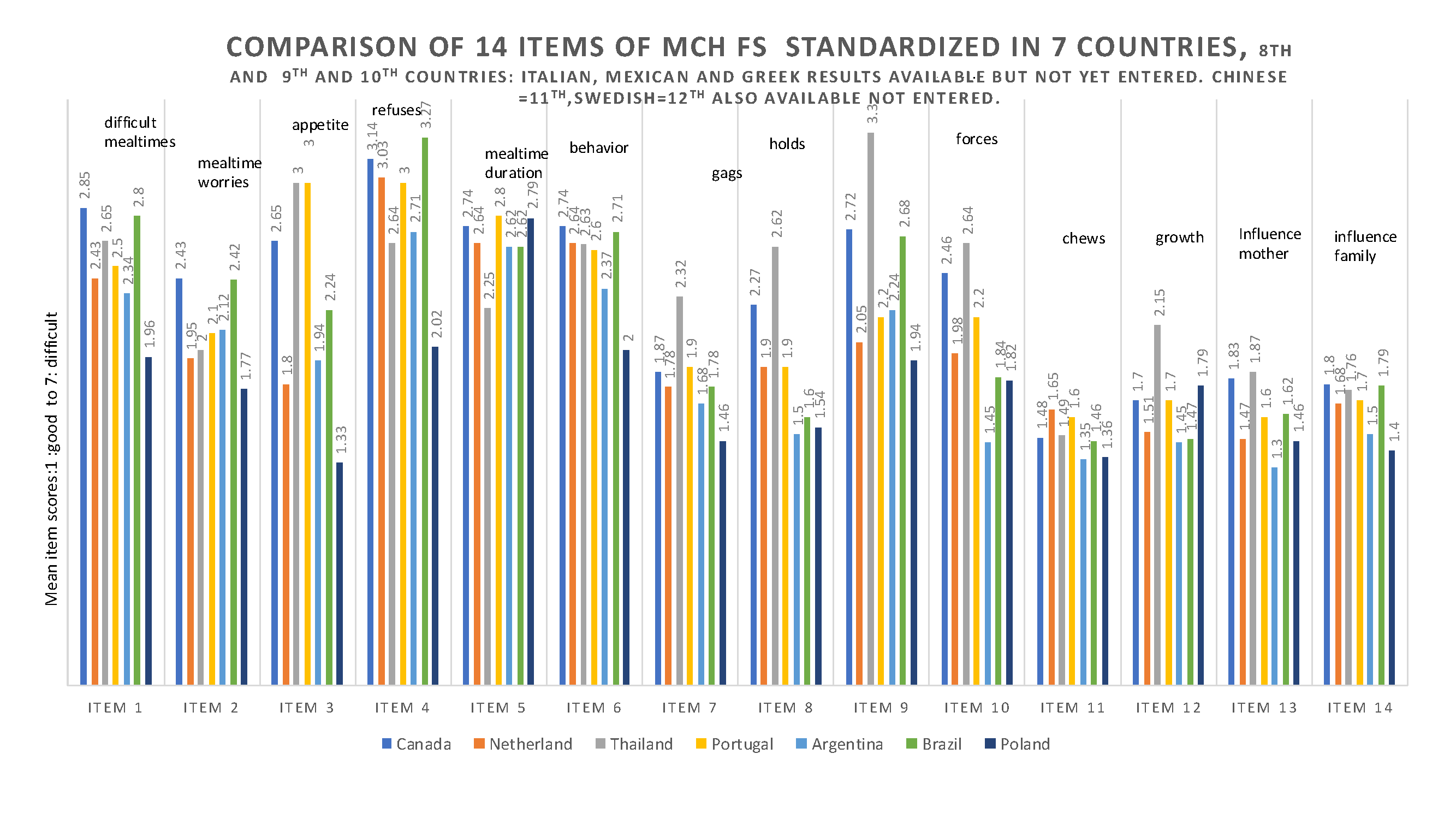 L'alimentation des nourrissons et des jeunes enfants peut s'avérer difficile. Initialement, l'échelle d'alimentation a été développée pour avoir un langage commun avec les mères sur les difficultés d'alimentation qu'elles rencontrent avec leurs enfants, et pour évaluer l'intervention. Cette échelle (MCH-FS) est devenue connue dans le monde entier et, à ce jour, elle a été traduite et standardisée sur une population d'enfants en bonne santé au Canada et dans plusieurs autres pays. L'auteure de cet article a approuvé toutes les traductions en utilisant des rétro-traductions avant que la version traduite puisse être utilisée dans 8 langues. Dans le graphique ci-dessous, il n'y a que 7 langues car le Canada a utilisé les résultats des langues anglaise et française combinées.66-77 L'échelle a ensuite été traduite et standardisée dans quatre autres langues : italien71, mexicain70,75, turc76 et mandarin77.